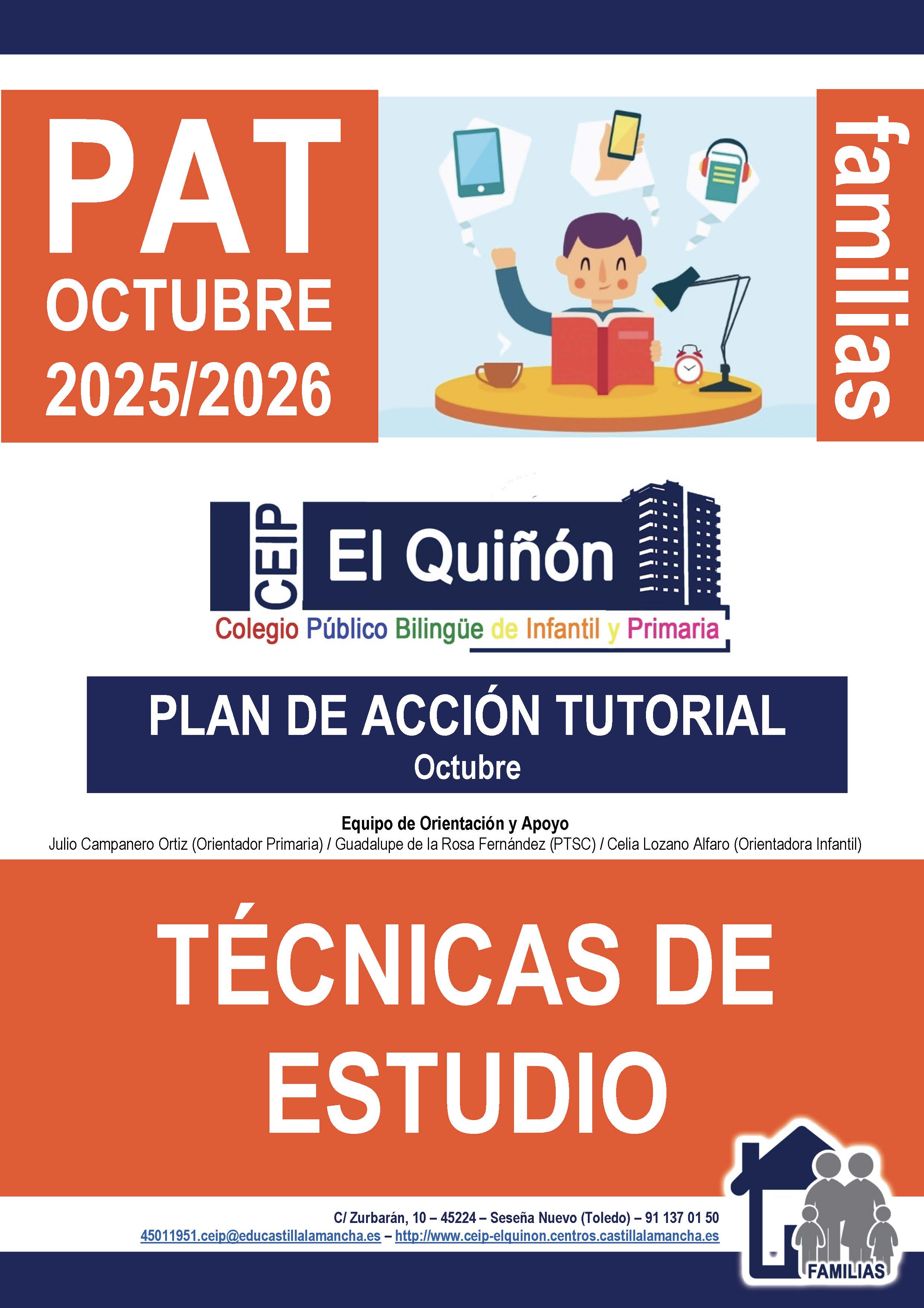 Como cada curso, comenzaremos a desarrollar en clase las distintas actividades de acción tutorial. Nuestro Plan de Acción Tutorial (PAT) trabaja una serie de temas transversales mensualmente, temas importantes para el desarrollo integral del alumno/a y que complementan los contenidos curriculares. Siendo así, durante el mes de octubre, los/las tutores/as y familias trabajarán como tema "Técnicas de estudio, rutinas y hábitos de trabajo". Adjuntamos poster y enlaces para familias.